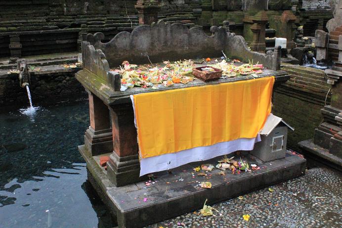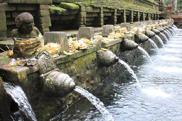 Es hora de continuar el camino, y nos vamos hacia el manantial sagrado de Tirtha Empul. Durante casi mil años los balineses han rezado en Tirtha Empul y venerado al dios Indra. Sus aguas se dicen que son sagradas y curativas por lo que acuden a bañarse a aquí. La zona más bonita y más atractiva del templo, es una alargada piscina alimentada por 12 caños del agua sagrada que proviene de una piscina en la parte superior donde se ve perfectamente salir el agua a borbotones.