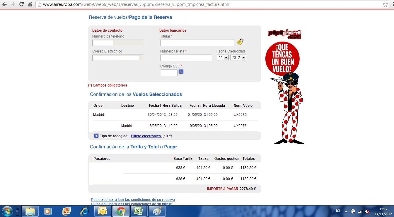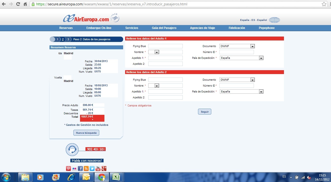 Al día siguiente, 15 de Noviembre ya, pepephone me informa que Aireuropa ha corregido el error y que ya podemos reservar.